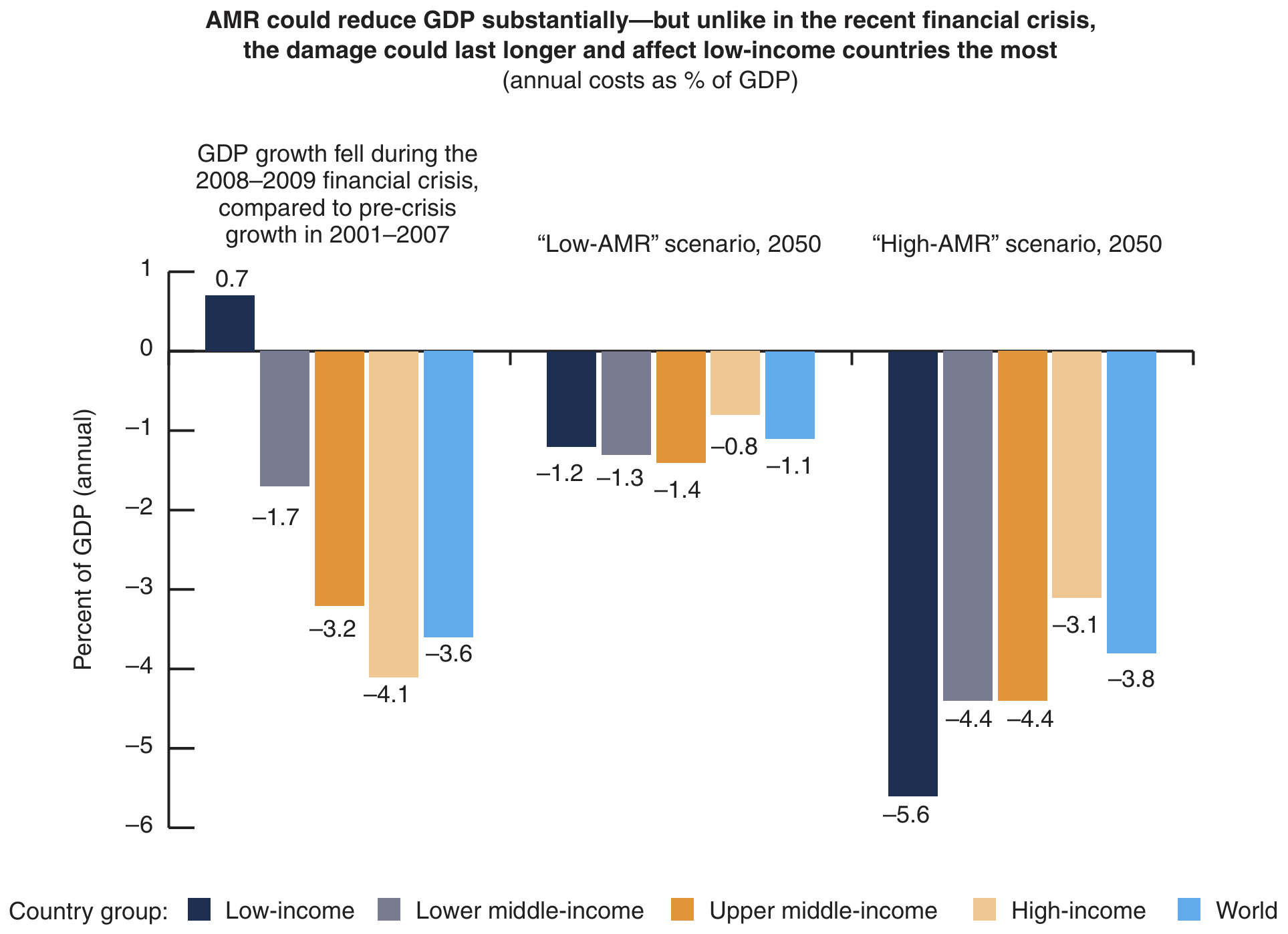 During much of the period through 2050, the annual reduction in GDP caused by AMR could be as large as the losses provoked by the 2008-2009 global financial crisis, with low-income countries experiencing larger drops in economic growth due to higher infectious disease prevalence and greater dependence on labour incomes.