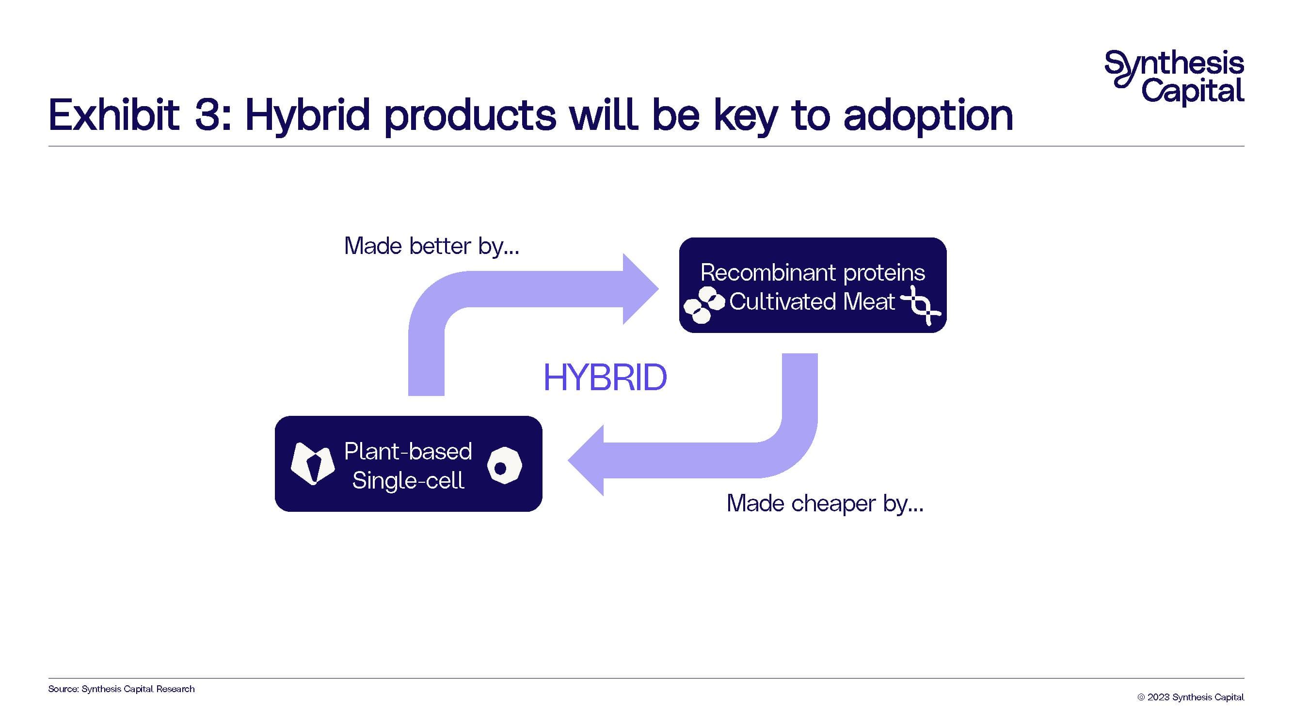 In “What are the Key Milestones for Alternative Protein Adoption to Reach S-Curve Growth?” we outlined why hybrid products are crucial to scaling up alternative protein technologies – they have the benefit of bringing down costs and improving the quality in terms of taste experience. Plant-based and single-cell proteins can make cultivated and recombinant proteins cheaper, and cultivated meat and recombinant proteins can make plant-based and single-cell based products better (Exhibit 3).